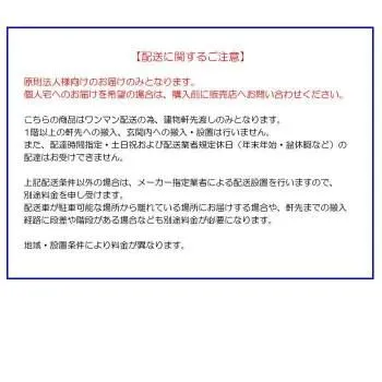 ※こちらの商品はワンマン配送の為、トラック停車可能位置での車上渡しのみとなります。荷受人を2名以上確保いただくようお願い致します。軒先や玄関内への搬入・設置は行いません。配達日時指定・土日祝および配送業者規定休日(年末年始・盆休暇など)の配達はお受けできません。上記以外の配達希望日の明記は可能ですが、確約ではございません。上記配送条件以外の場合は、メーカー指定業者による配送設置を行いますので、別途料金を申し受けます。駐車可能な場所から離れている場所にお届けする場合、別途料金が発生することもございます。