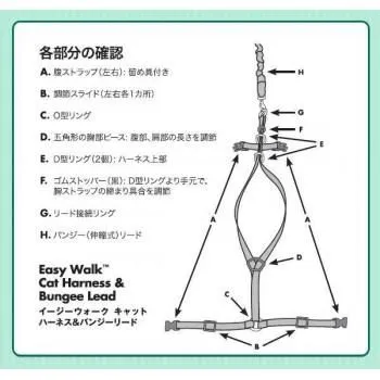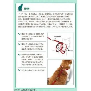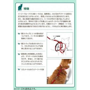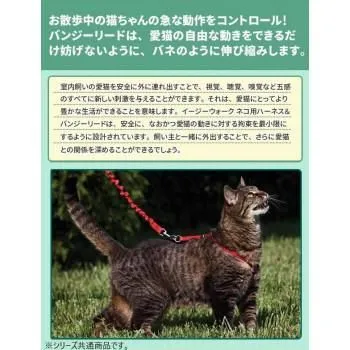 動きやすさと安全を考えた、ハーネスとバンジーリードのセットです。愛猫の喉を締め付けず、安全に、かつ抜け出すことがないようにぴったりフィットさせることができます。ワンタッチバックルでハーネスの着脱も簡単。バンジーリードの長さは約1mで、リード部分が伸び縮みするので、動きやすく快適に装着いただけます。胴回りが約27~36cmのネコちゃん用。