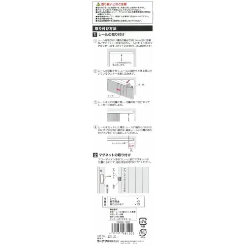 【取り扱い上のご注意】 取り付けネジは木部用です。木部以外には使用できません。 アコーディオンドア本体にぶら下がらないでください。 お手入れの際は、シンナーやベンジンなどの揮発性溶剤の使用はお避けください。 暖房器具のそばなど、 高温になる場所に近付けないでください。 本品は屋内用です。 本品は家庭用です。 業務用には使用しないでください。
