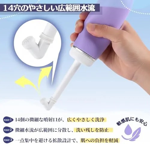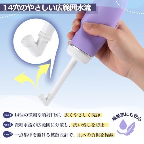 【快適洗浄の秘密!400ml大容量 & 14穴広域ノズル】 400mlの大容量タンクで、外出先でも水の継ぎ足し不要。たっぷり洗えて経済的!洗浄性能の鍵は14個の微細水流穴。広範囲をやさしく均一にカバーする水流が、洗い残しを防ぎスッキリ快適な洗浄感を実現します。従来品より広がる洗浄エリアが特徴です。