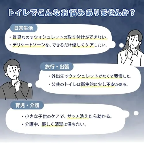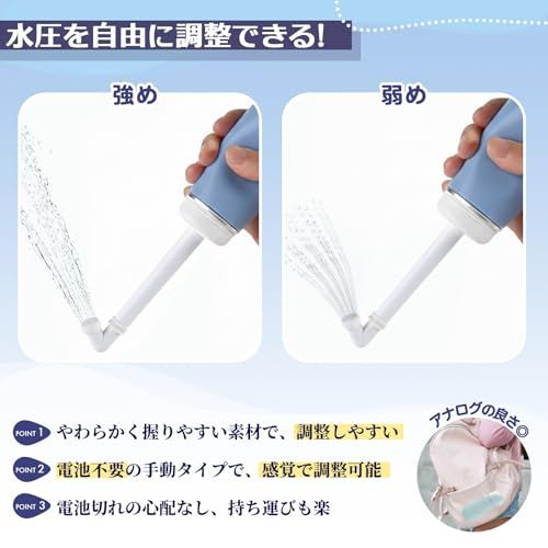 【充電・電池完全不要!手動式の確かな利点】 モーター不要の手動式おしり洗浄器だから、充電切れ・電池切れの心配ゼロ!軽く握る力加減で水流を自在に調節でき、お肌に優しい洗浄からしっかり洗い流しまで、その時々のニーズにピッタリ合わせられます。旅行・アウトドアでも電源を気にせず使える安心設計です。