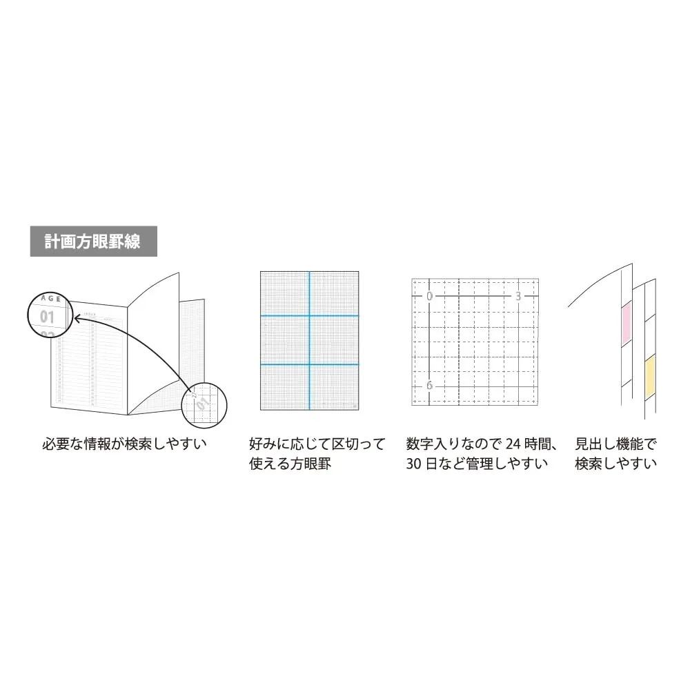 ●計画方眼罫線タイプ…好みに応じて区切って使える方眼罫。数字入りなので24 時間、30日など管理しやすい。
