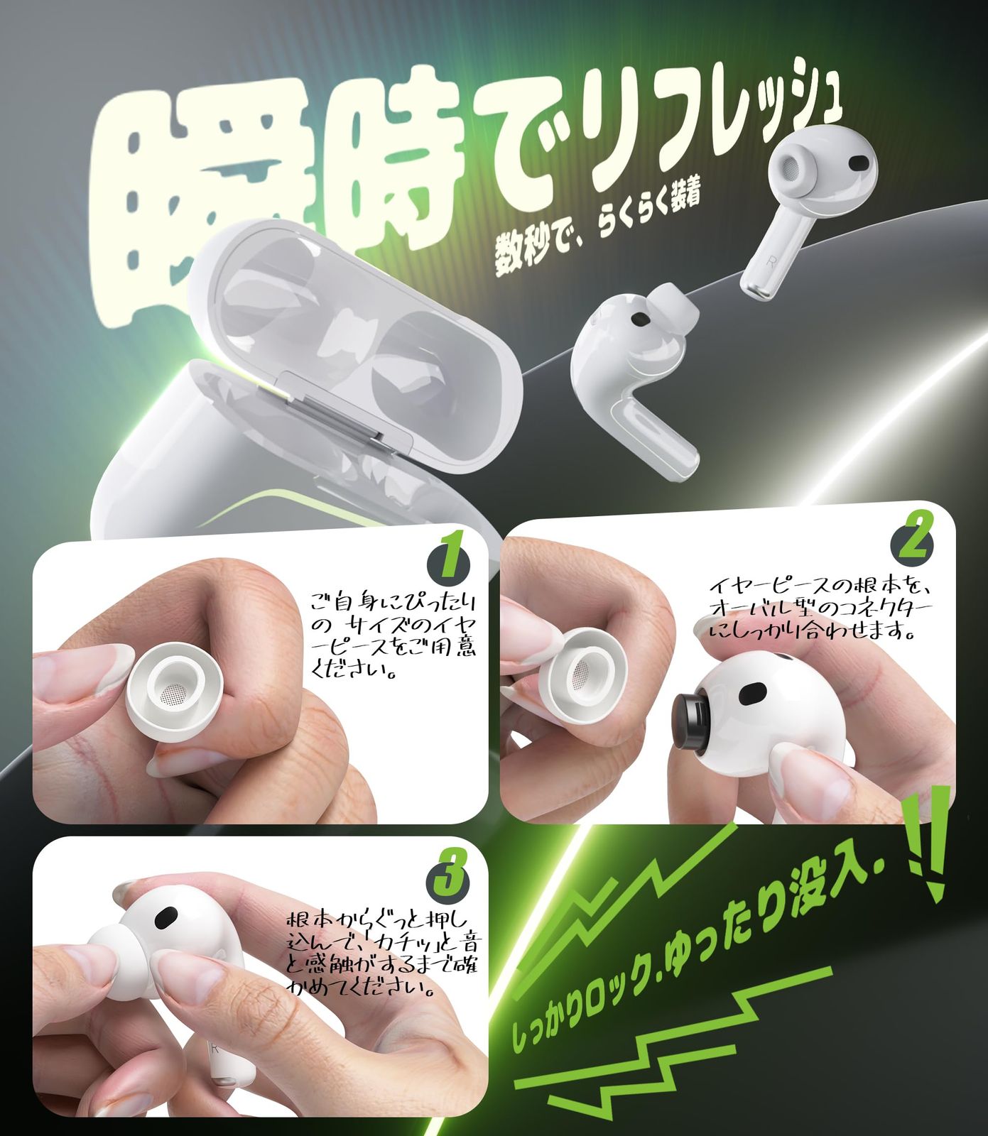 【ご注意】イヤーピースを交換する際に、柔らかいシリコンゴムの先端を裏返しにし、イヤーチップの基部(サイズ表示の箇所)をしっかりと握り、完全に外れるまでひねりながら引き抜いてください。よりしっかり握れるため、ティッシュや清潔な布を使用できます。
