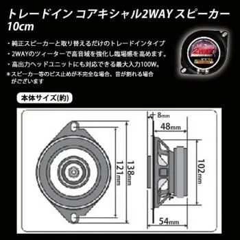 純正スピーカーから手軽にシステムアップできるトレードインタイプのスピーカーです。2WAYのツィーターで高音域を強化し臨場感を高めます。高出力ヘッドユニットにも対応できる最大入力100W。