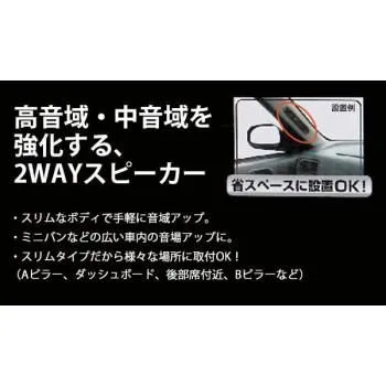 高音域・中音域を強化する、2WAYスピーカーです。スリムタイプなのでA・Bピラー、ダッシュボード、後部席付近など狭い場所に取り付け可能。ミニバンなどの広い車内の音場アップにも。