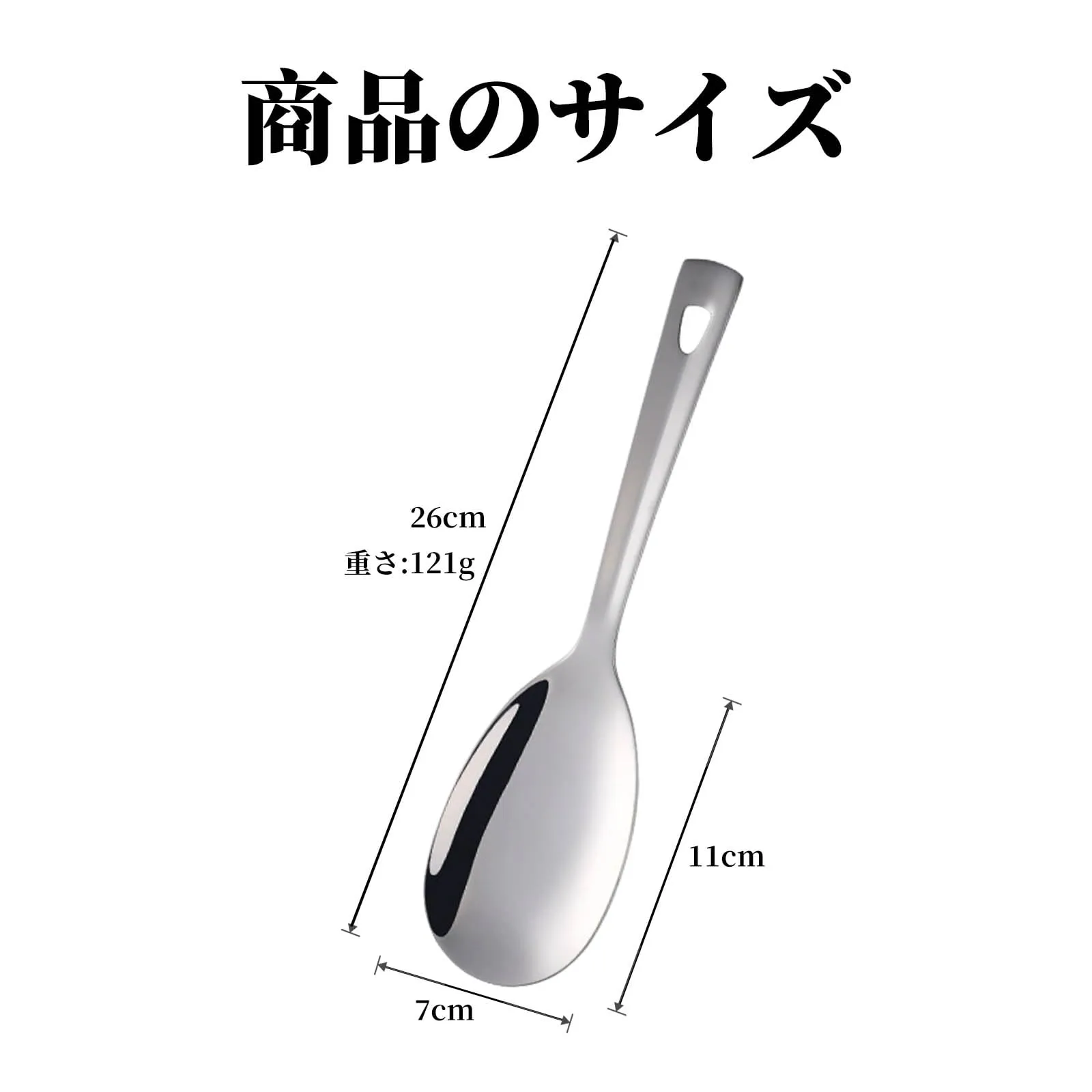 【詳細サイズと実用性】:全長26cm、幅7cm、重量121gで、ほとんどの鍋や食器に適合。ハンドル部の吊り下げ穴で収納に便利。継ぎ目のない設計で汚れが溜まりにくく、耐熱性により高温の食材に直接接触可能。利便性と実用性を両立。