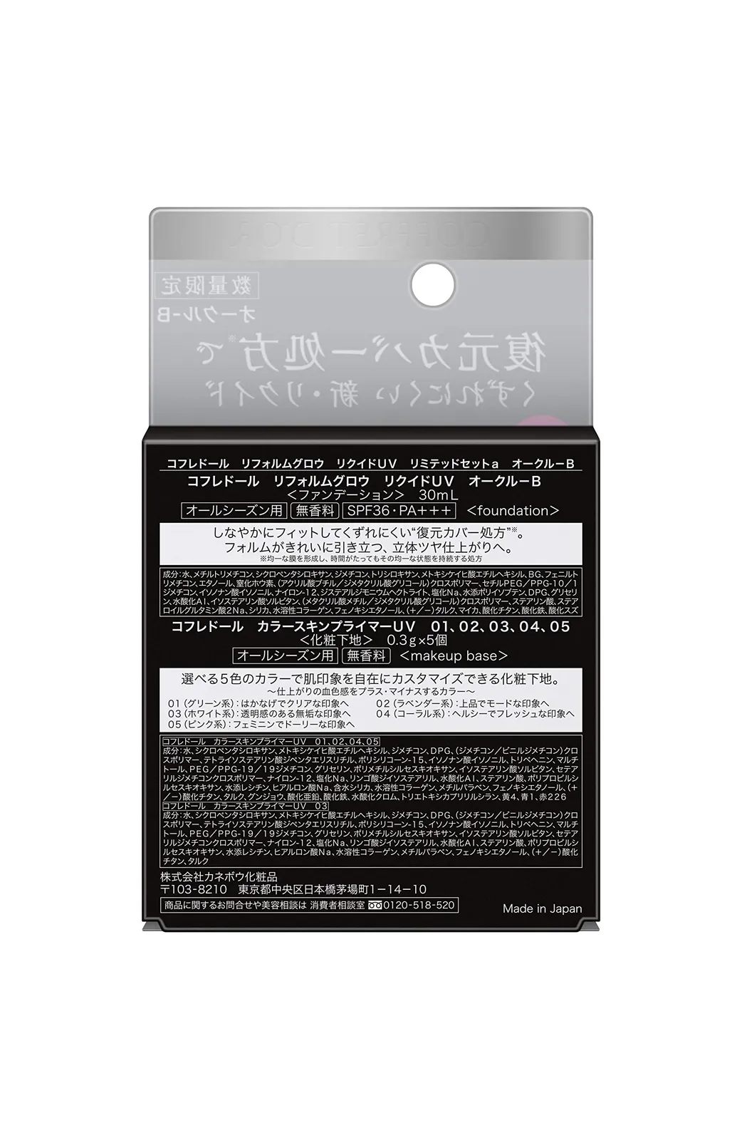 ■カラースキンプライマーUV 01、02、04、05 成分:水、シクロペンタシロキサン、メトキシケイヒ酸エチルヘキシル、ジメチコン、DPG、(ジメチコン/ビニルジメチコン)クロスポリマー、テトライソステアリン酸ジペンタエリスリチル、ポリシリコーン-15、イソノナン酸イソノニル、トリベヘニン、マルチトール、PEG/PPG-19/19ジメチコン、グリセリン、ポリメチルシルセスキオキサン、イソステアリン酸ソルビタン、セテアリルジメチコンクロスポリマー、ナイロン-12、塩化Na、リンゴ酸ジイソステアリル、水酸化Al、ステアリン酸、ポリプロピルシルセスキオキサン、水添レシチン、ヒアルロン酸Na、含水シリカ、水溶性コラーゲン、メチルパラベン、フェノキシエタノール、(+/-)酸化チタン、タルク、グンジョウ、酸化亜鉛、酸化鉄、水酸化クロム、トリエトキシカプリリルシラン、黄4、青1、赤226