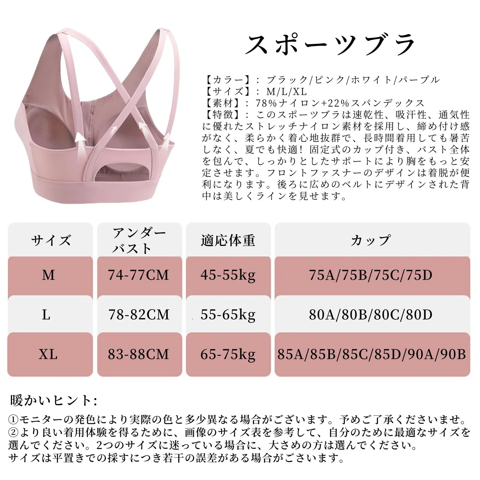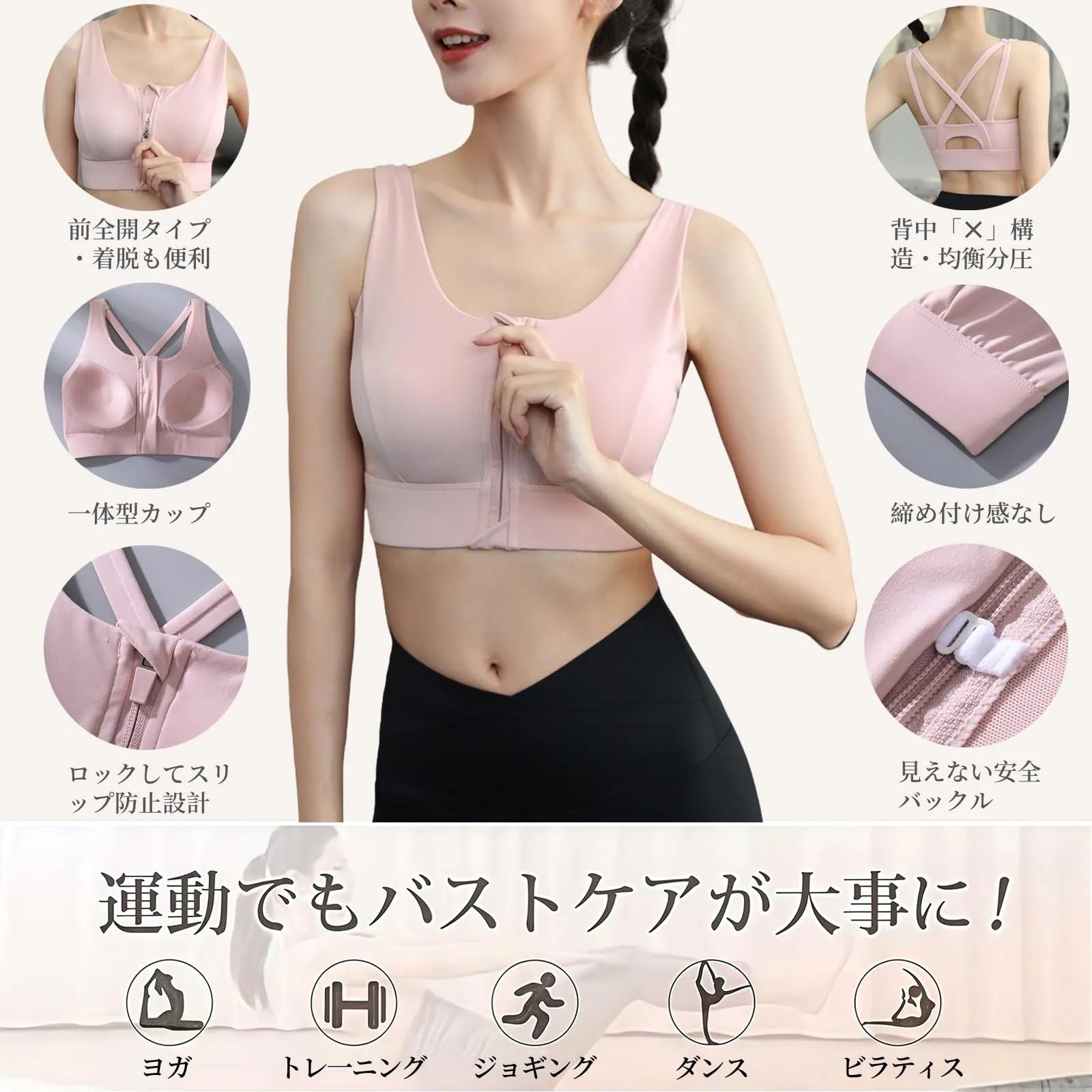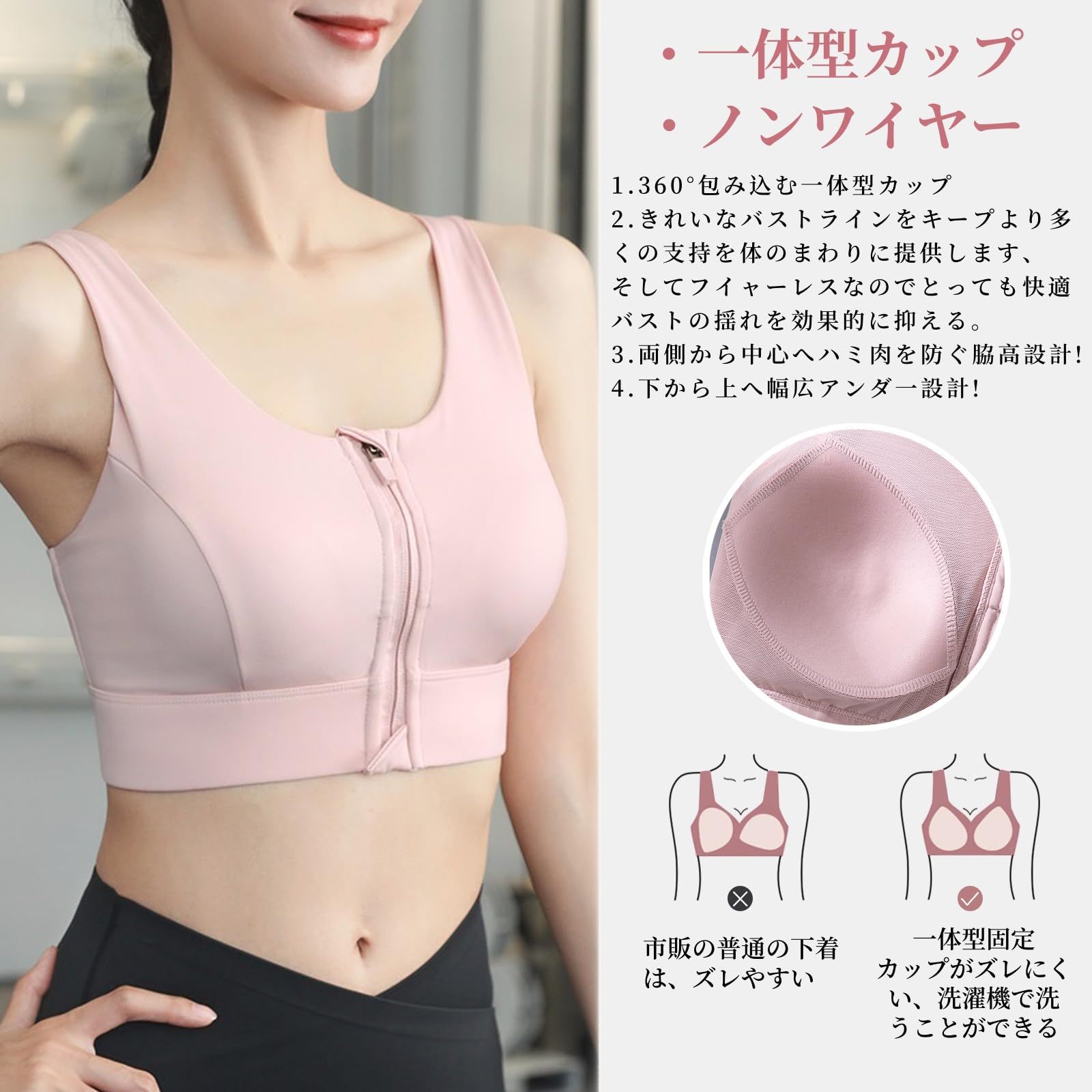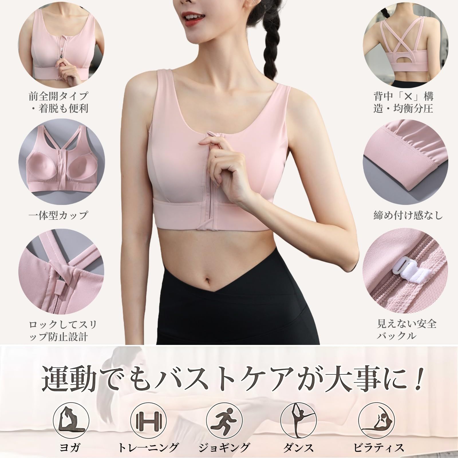 【前全開タイプ・1秒で着脱のに苦しくない】 運動後:大量汗と力不足の状況を考慮して、前開き設計は運動者が素早く楽にブラを脱ぐのを助けることができて、少しも苦しくありません。汗をいかた後でも脱ぎやすいし、着脱が楽ちん!?運動前:前開きスポーツブラを身につけるのはとても便利で、きれいなメイクや髪型を崩れないする心配もありません。運動も美しくしなければなりません!前全開タイプのは背面ホックが苦手な方の福音。
