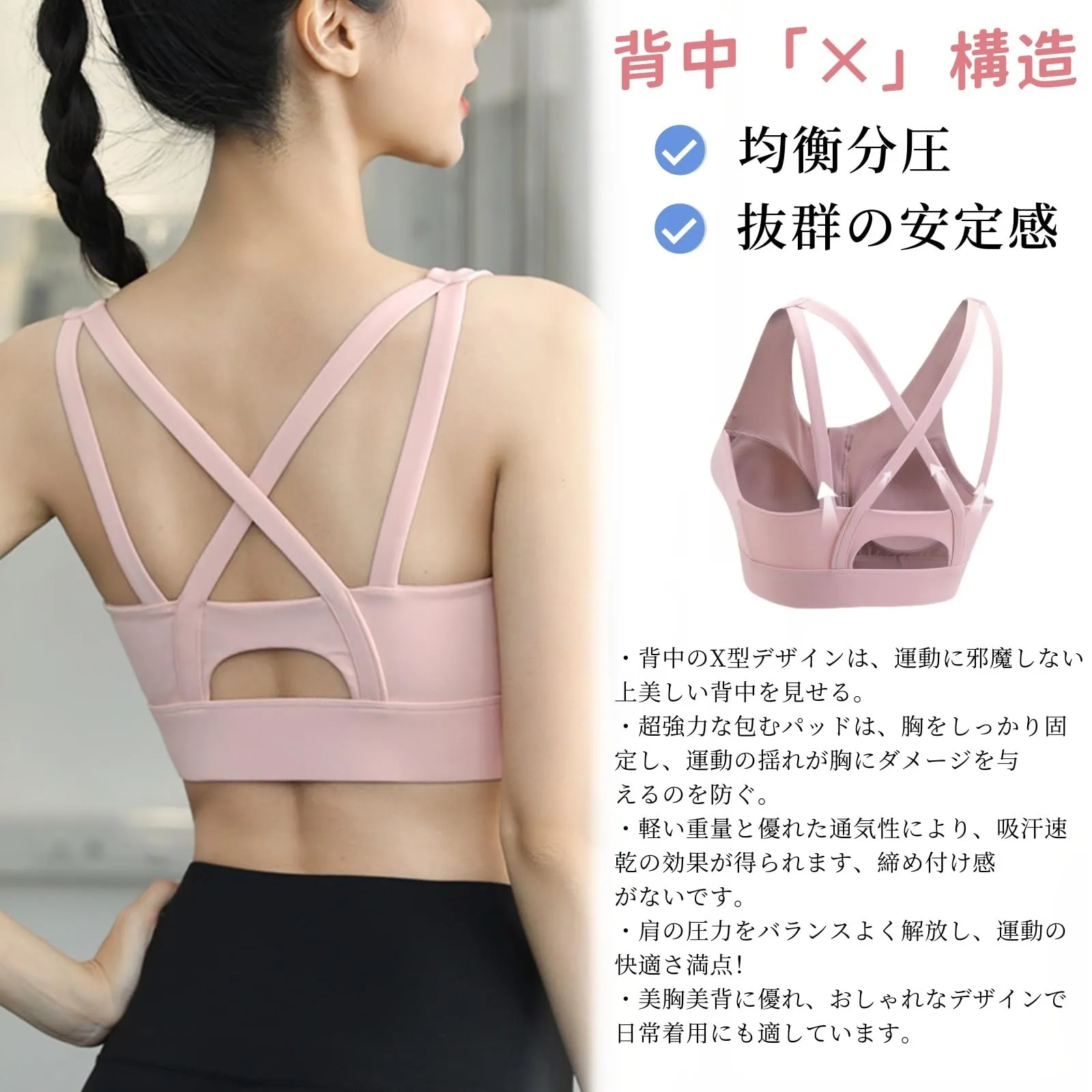 【背中「?」構造・均衡分圧】ストレッチ性のある素材を使い、ブラジャーの安定性を高め、運動時の胸揺れを心配する必要なし、スポーツをもっと自由になります。背中のX型デザインは、運動に邪魔しない上美しい背中を見せる。超強力な包むパッドは、胸をしっかり固定し、運動の揺れが胸にダメージを与えるのを防ぐ。軽い重量と優れた通気性により、吸汗速乾の効果が得られます、締め付け感がないです。美胸美背に優れ、おしゃれなデザインで日常着用にも適しています。