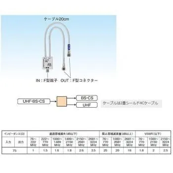 出力ケーブル付、地デジ/BS・CS分波器(セパレーター)です。F型コネクターで設置可能です。4K8K放送に対応!!