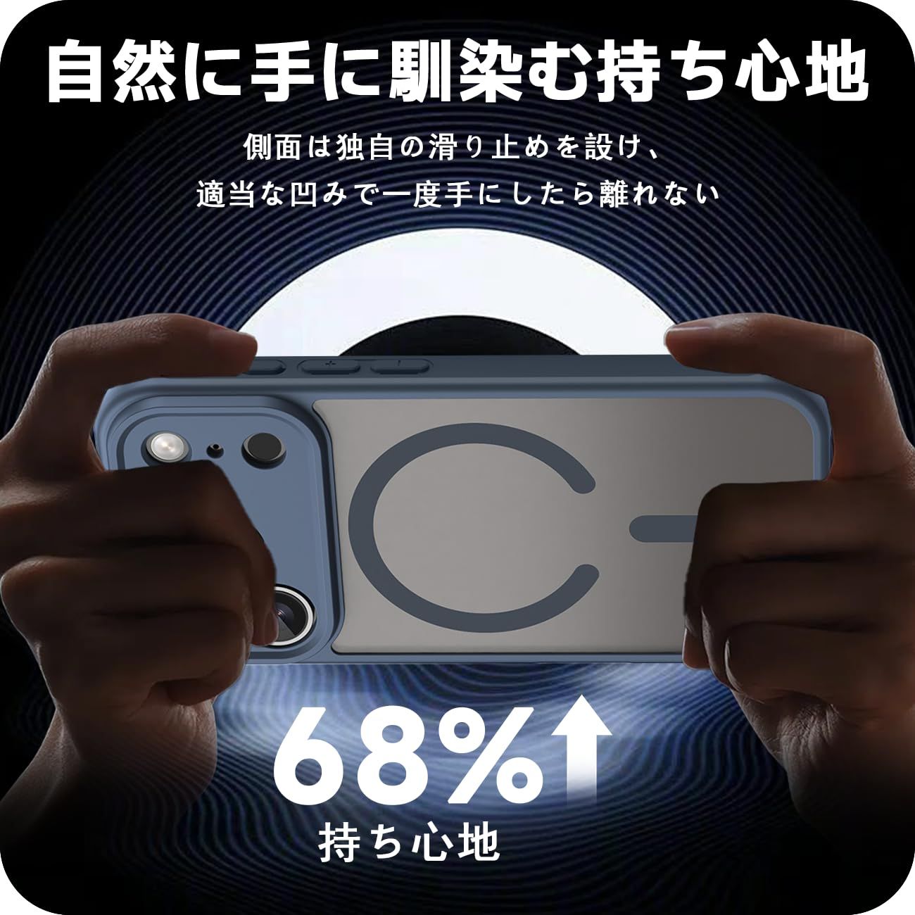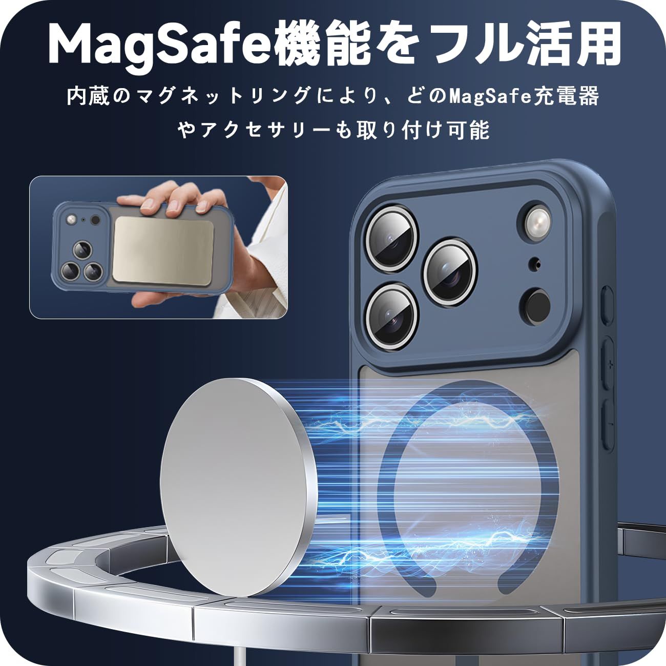 【磁気充電対応】背面に内蔵した専用磁気回路が充電効率を最適化。1,200gの保持力を持つ強力な内蔵マグネットが、より速く、より便利な瞬間ワイヤレス充電、およびMagSafeアクセサリーによる安全な磁気固定を可能にします。