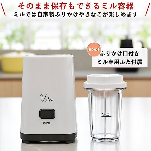 【ミル容器付き】最大容量75mlのミル容器付き。コーヒー豆を挽くのはもちろん、自家製きなこやふりかけ、スパイス作りなどが楽しめ、調理の幅が広がります。