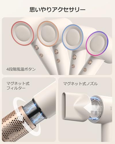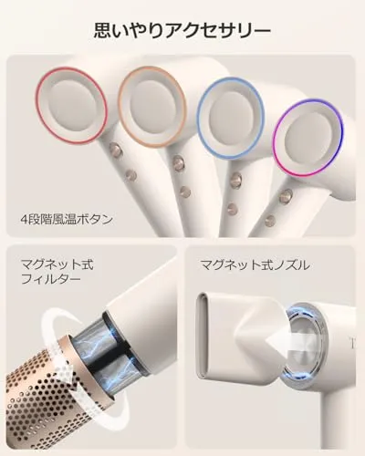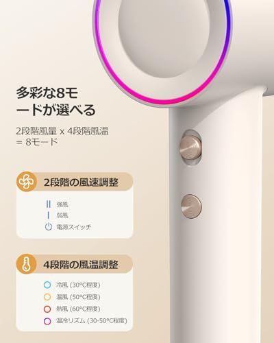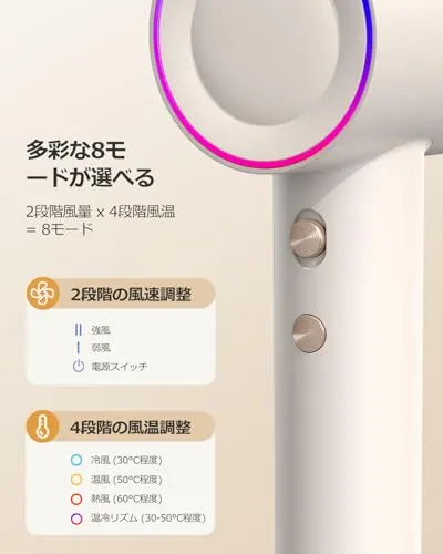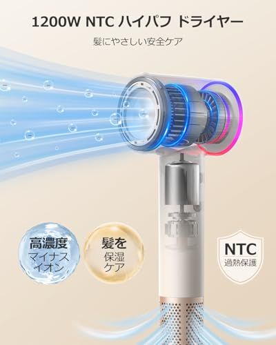 【美容院レベルの美髪ケア】 1億濃度マイナスイオン発生装置 角質層の密着補修静電気発生率78%抑制(第三者機関検証済) 50低温ドライシステム タンパク質熱変性防止頭皮への負担軽減設計 温冷リズムモード(4段階温調2段風速) 熱ダメージと縮毛の両方を防止寝ぐせ直しにも最適