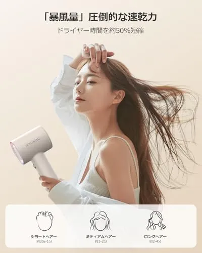 【業界最速クラスの速乾性能ドライヤー】 110,000rpm超高速ブラシレスモーター 5m?/minの暴風量で髪表面の水分を物理的に飛散 従来比50%短縮のドライタイム実現(熱曝露時間低減) 22m/s航空機級風圧技術 根元から毛先まで均一乾燥太いロングヘアも3分で完了