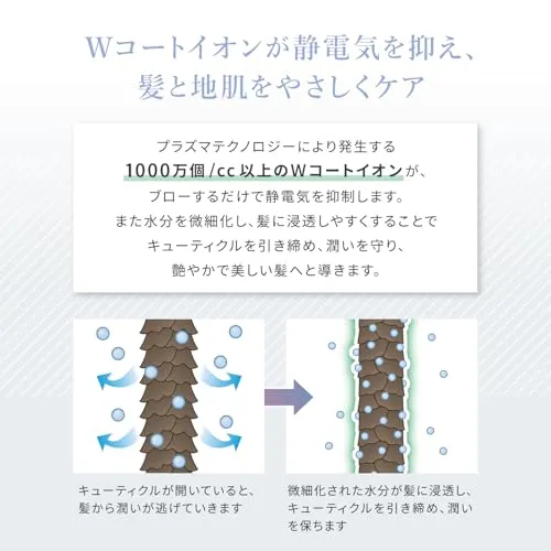 プラズマケア:1000万個/cc以上のWコートイオンが髪の潤いを守り、静電気を抑制します。