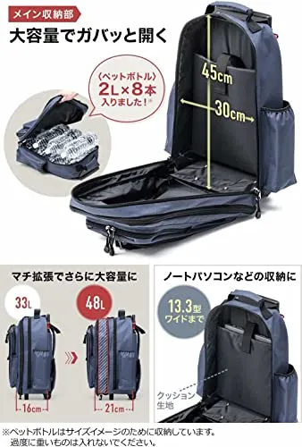 メイン収納部は、ダブルジップ式でガバっと開いて使いやすく、容量も33L48L(マチ拡張時)に対応します。メインルームにはパソコンを収納できるクッションポケット付きです。