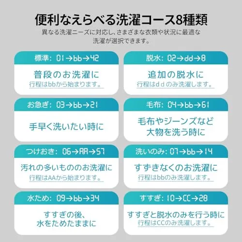【選べる8種類洗濯コース】?標準:普段のお洗濯に、?脱水:追加の脱水に、?お急ぎ:手早く洗いたい時に、?毛布:毛布やジーンズなど大物を洗う時に、?つけおき:汚れの多いもののお洗濯に、?洗いのみ:すずきなくのお洗濯に、?水ため:すすぎの後、水をためたままに、?すすぎ:すすぎと脱水のみを行う時に