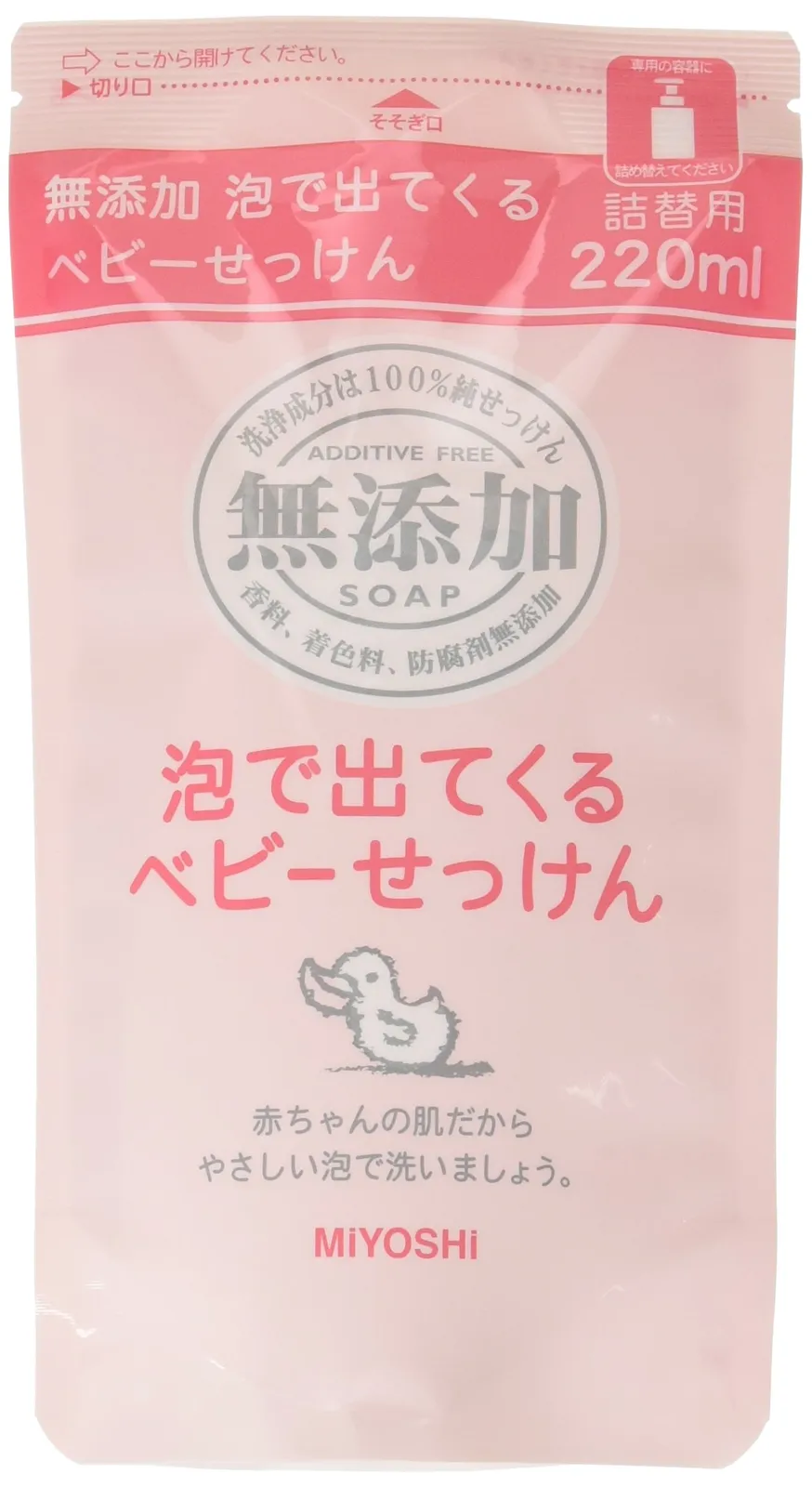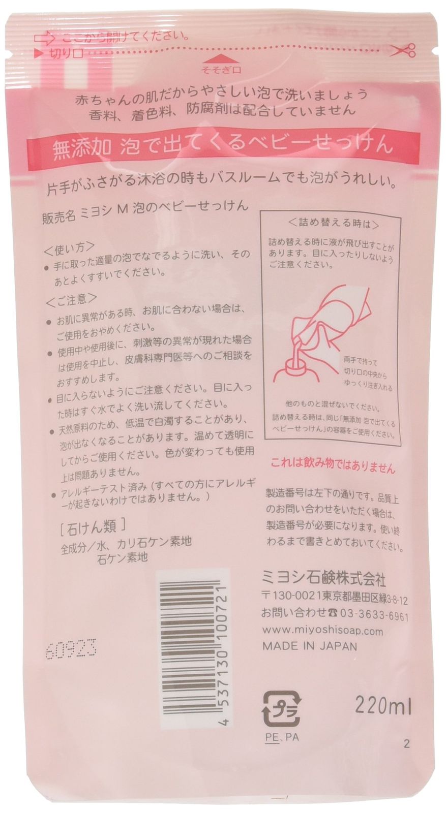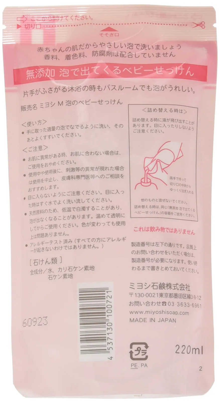 赤ちゃんの肌だからやさしい泡で洗いましょう! 洗浄成分は100%純せっけん!! 香料・着色料・防腐剤は配合していません! ・片手がふさがる沐浴の時もバスルームでも泡がうれしい。 ・アレルギーテスト済み。(全ての方にアレルギーが起きないわけではありません。)