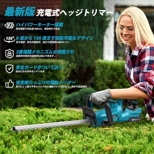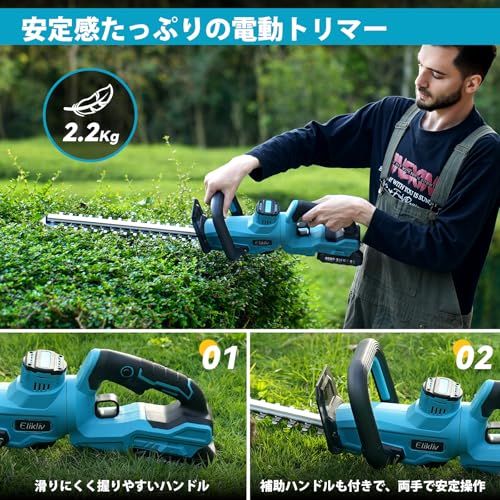 【革新的な 350 度回転機能を搭載した充電式ヘッジトリマー】従来販売しているヘッジトリマーには回転機能がなく、側面の剪定を行う際には手で強く握る必要があり、大変な負担となり、長時間作業すると手が痛くなり、変形の恐れさえあります。しかし、Elikliv のヘッジトリマーは製品本体が 0135 度回転自在で、切断角度や持ち方を自在に調整できます。人間工学設計により省力的で、長時間作業でも疲れず、作業効率を大幅にアップさせます。手の負担を軽減しながら、快適かつ効率的な作業をサポートします。Elikliv のヘッジトリマーを選ぶことで、あなたの剪定作業をよりスムーズかつ楽しく進めることができます。快適さと機能性を兼ね備えた画期的なツールを今すぐ体験しましょう。