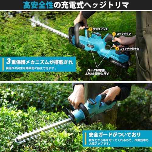 【高安全性の電動ヘッジトリマー】安全面でも画期的な設計を施しています。3 重保護メカニズムを搭載しており、ロックボタン(1)、スイッチの引き金(2)、安全スイッチ(3)が組み合わさって、誤操作の発生を効果的に防止します。使用時にはロックを解除した後、スイッチの引き金と安全スイッチを同時に押す必要があります。また、付属の安全ガードにより、作業中に枝などから手をしっかりと守ってくれます。これにより、安心して作業ができるだけでなく、作業効率も大幅に向上します。安全と機能性を兼ね備えたこのヘッジトリマーをぜひお試しください。
