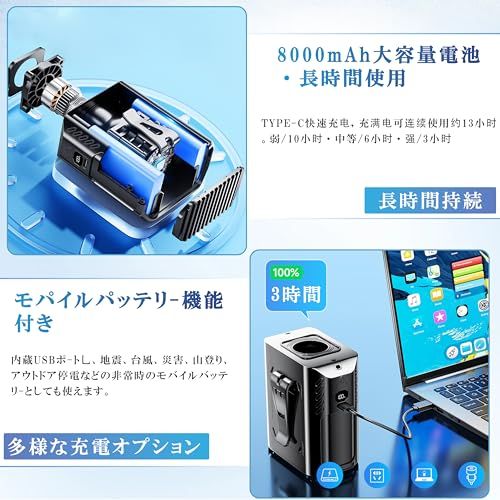 【8000mAh大容量バッテリー】最長20時間連続稼働! 高容量リチウム電池搭載で、フル充電後は最大20時間使用可能(弱風モード時)。