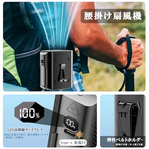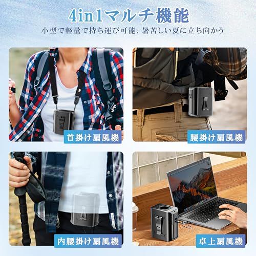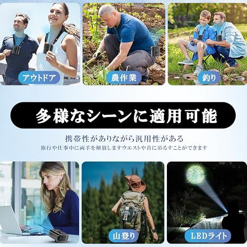 【5in1多機能ファン】:携帯性がありながら多機能です。ベルトやパンツに取り付けて体を冷やすためのウエストハンギングファンとして、また夏の旅行中に手を自由にするための首掛けファンとして使用することができます。さらに、LEDライト、SOSライト、デスクトップファン、ネックファンとしても使用することができます。