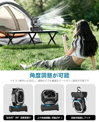 自動首振り機能で広範囲送風テント用扇風機: 自動首振り機能を搭載し、広い範囲に風を届けることができます。テント内全体を効率的に冷却し、複数人でのキャンプでも快適な環境を提供します。