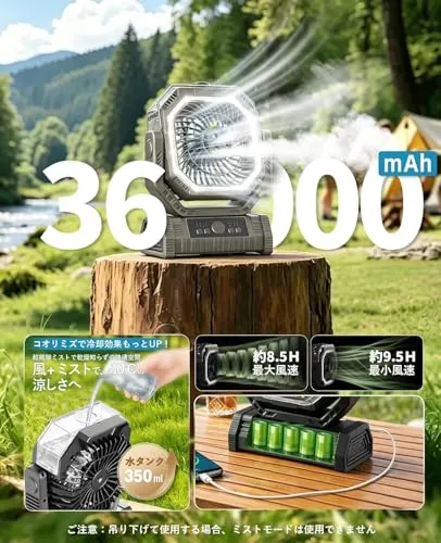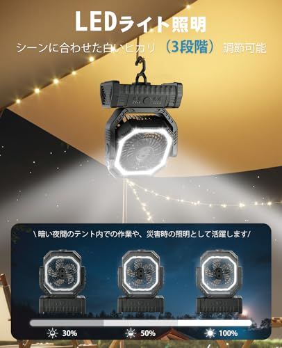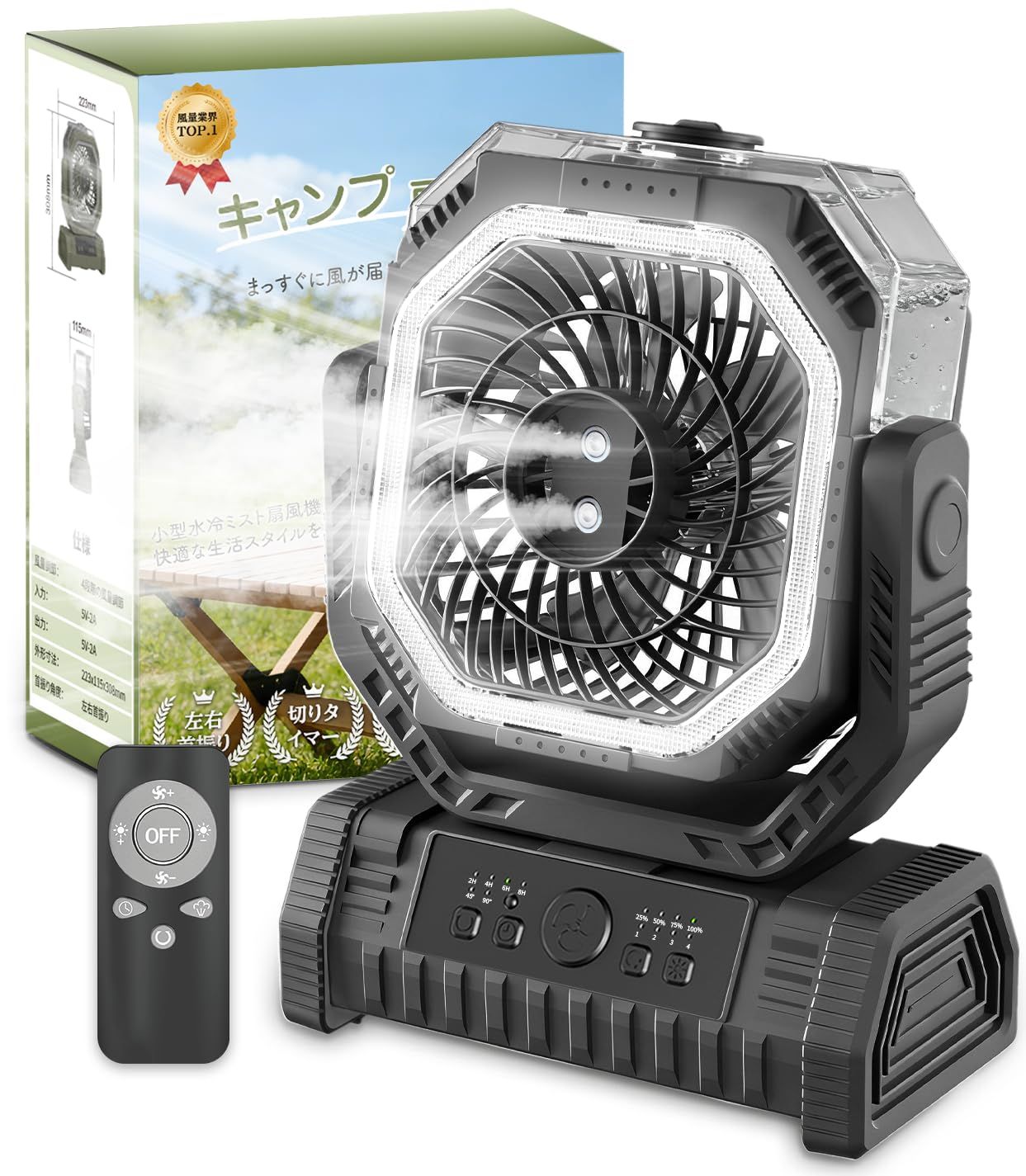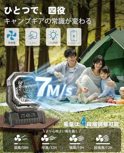 LEDライト付き多機能一台: 明るさ調整可能なLEDライト内蔵、キャンプの夜間照明や非常灯として活用。ファン・ミスト・ライトの3機能が一体となり、キャンプ用品の荷物を削減、持ち運びが超便利。テント内・卓上での使用に対応。キャンプ 扇風機用として最適。