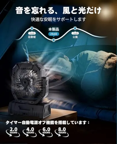 タイマー機能で省エネと使い忘れ防止: 2/4/6/8時間のタイマー設定に対応、電源の切り忘れを防ぎ、バッテリーを節約。静音設計で、夜間の睡眠を妨げず、テント内で静かに使用可能。安全な素材を使用し、子供のいるご家庭でも安心。