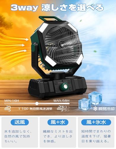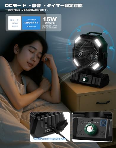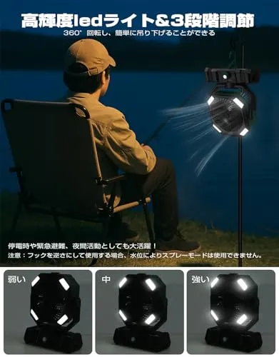 【高輝度LEDライト&360耐荷重フック】このキャンプ扇風機には、高輝度LEDライトを搭載します。均一な光配分で目に優しく、3段階調光機能を備えています。ファンの底部には360回転可能な耐荷重フックが付いています。テントに簡単に吊るすことができます。卓上扇風機として使用する場合、底面の滑り止めパッドは安定性も確保されます。停電時や緊急避難、アウトドアとしても大活躍!