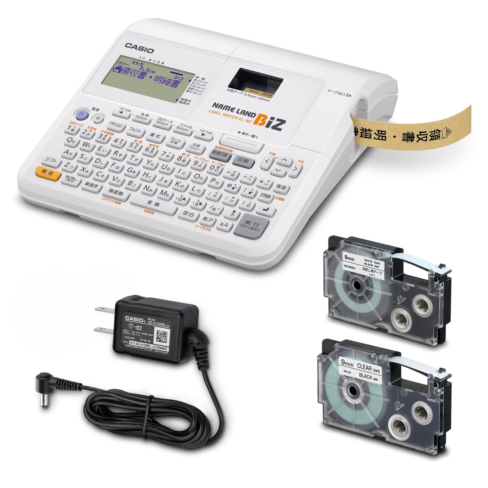 【付属品】ACアダプター、9mm幅お試しテープ1本、9mm透明テープ(XR-9X)
