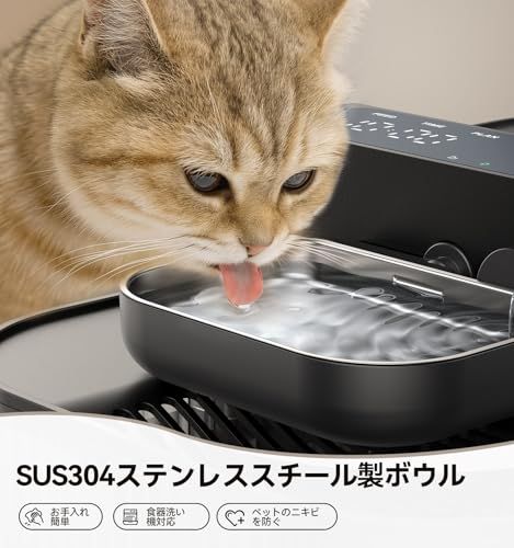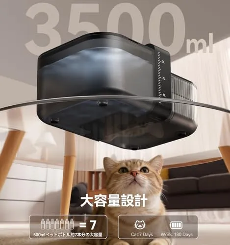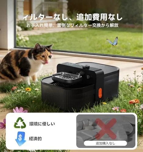 フィルター不要自動給水器:コスト削減と環境配慮を両立した、シンプル設計のペット用給水器です。従来品のような交換用フィルターが不要なため、定期的なフィルター購入の手間やランニングコストを大幅に削減。長期的な家計の負担を軽減するだけでなく、使い捨てフィルター廃棄による環境負荷も低減します。「より経済的で、よりエコフレンドリー」を実現した本製品で、愛犬・愛猫への健康的なケアを、より無理なく、より快適に続けられます。