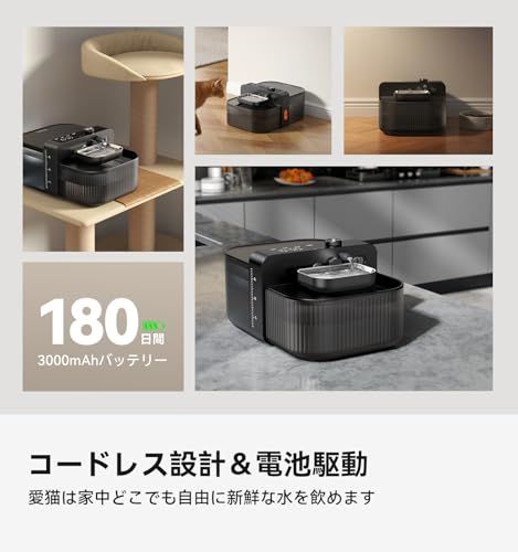 コードレス設計、どこにでも設置可能:コンセントの場所を気にしない、コードレス仕様のペット自動給水器。リビングの片隅、日差しが