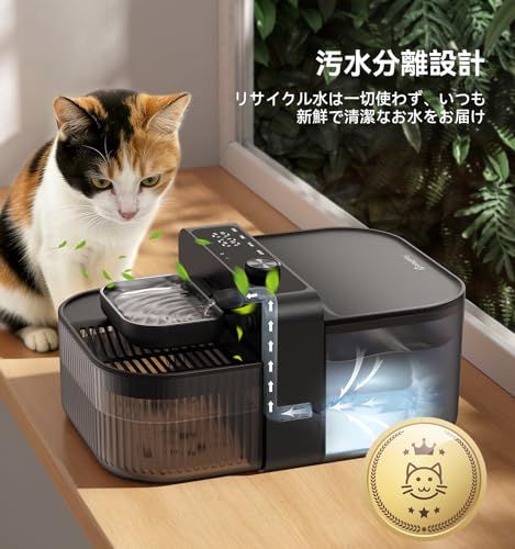 革新の清濁分離設計--清らかな水と汚れた水を完全分離:真の健康は、「清」と「濁」を完全に切り離すことから始まります。本猫給水器は、給水される新鮮な活水と、飲み残しの汚水を物理的に完全分離することで、クロスコンタミネーション(二次汚染)を徹底的に防止。トレイ内には補充されたばかりの澄み切った清水だけが常に保たれ、雑菌や微生物が繁殖する温床そのものを排除します。「水源」からの徹底ガードにより、愛犬・愛猫が水を飲むひとときが、いつも安心で満たされます。