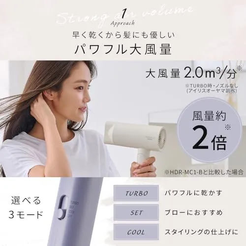 【大風量2.0m?/分】大風量の2.0m?/分でアイリスオーヤマのHDR-MC1-Bのドライヤーと比べると風量が約2倍になります。(※TURBO時・ノズルなし・アイリスオーヤマ調べ)パワフルな風量で早く乾くから髪へのダメージを減らします。