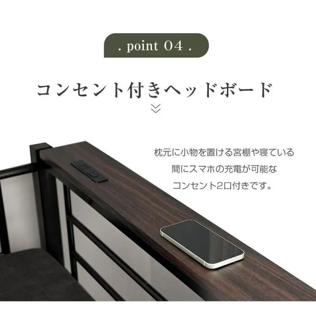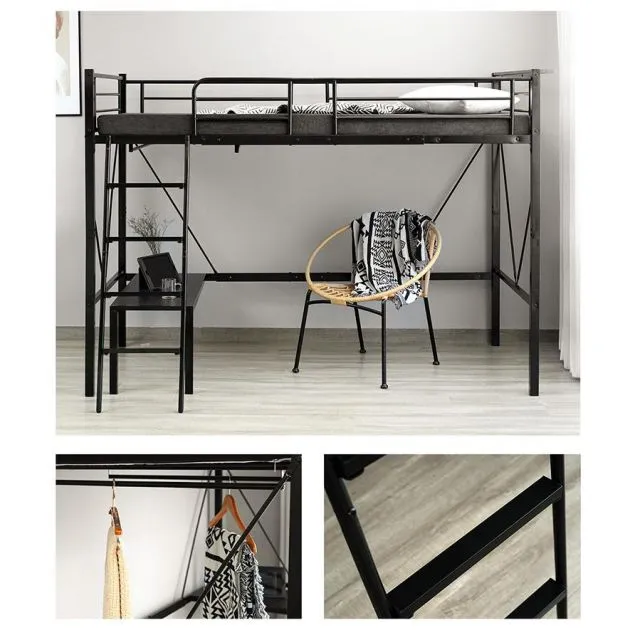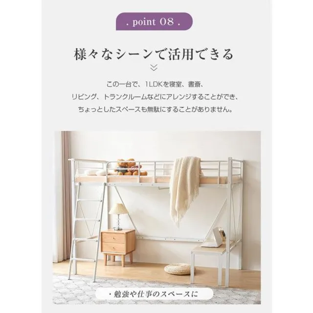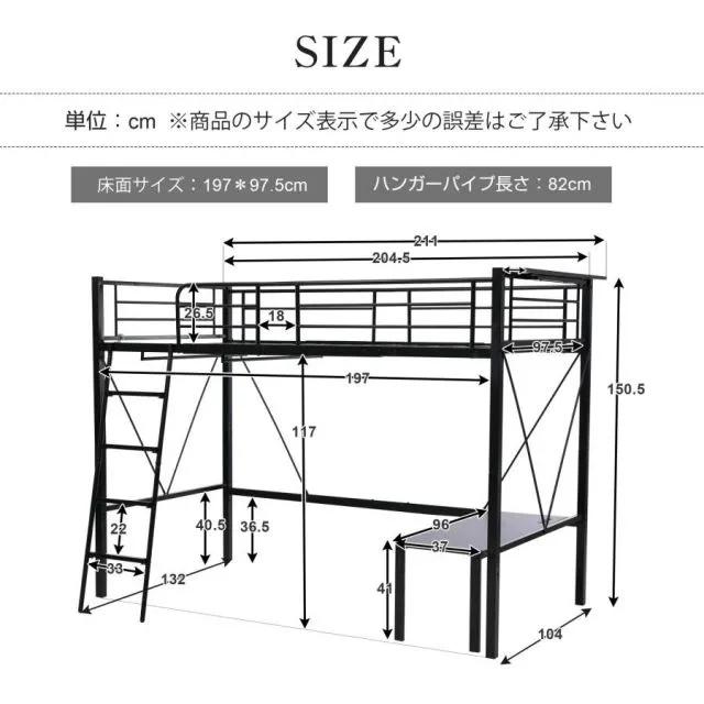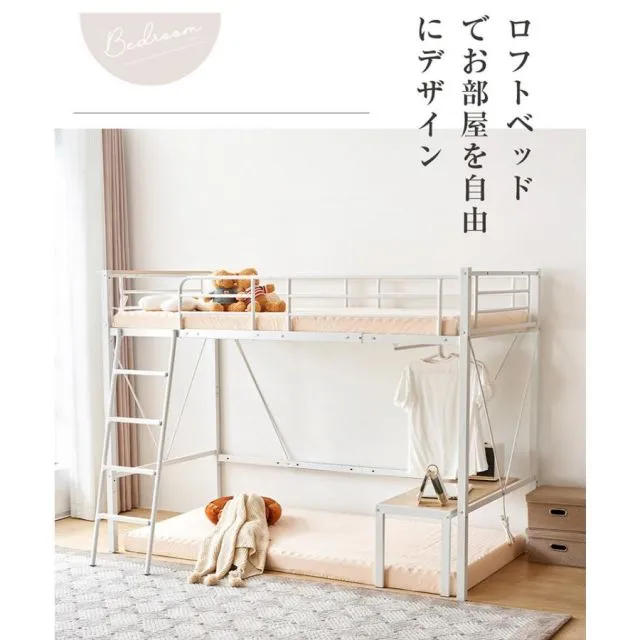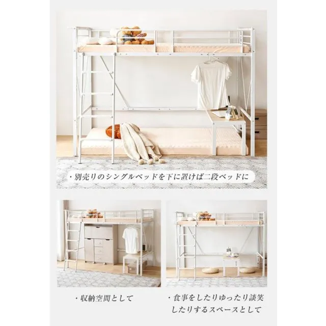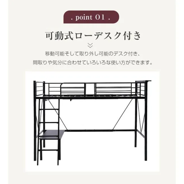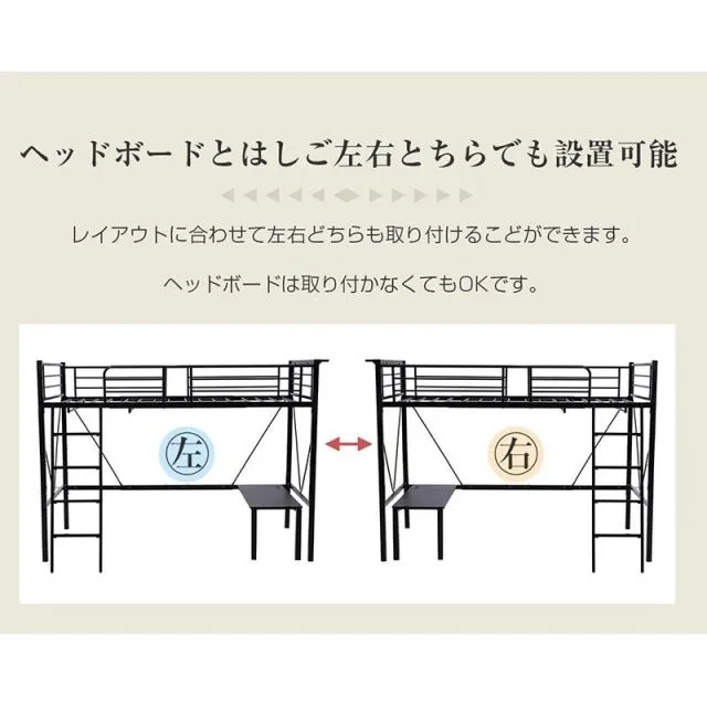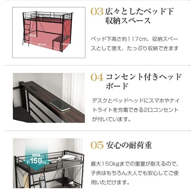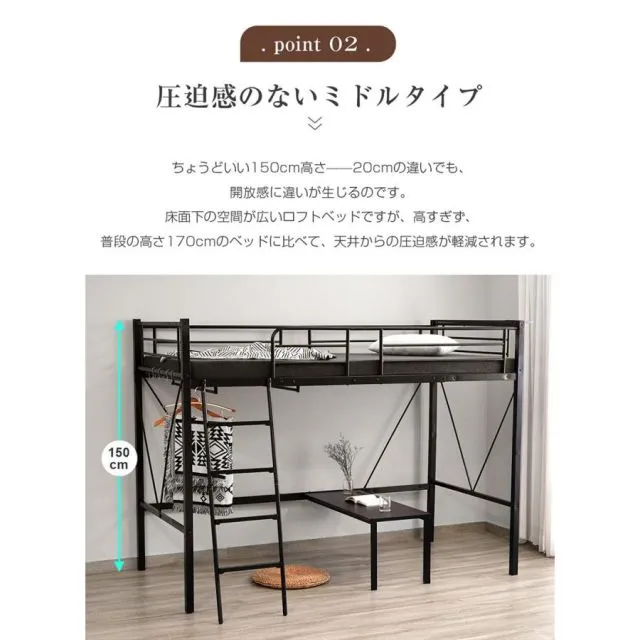 商品名:ロフトベッド シングル コンセント付き ミドルタイプ 高さ150cm ローデスク付き アイアンベッド