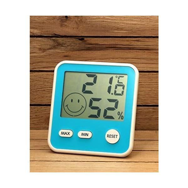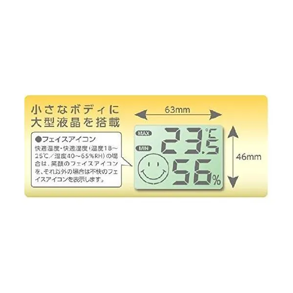 外枠カラー:ブルー|タイプ:置き・掛け兼用型|使用範囲:温度 0-50゜C, 湿度 20-90%RH|精度:湿度 ±1゜C(0-40゜C) ±2゜C(左記以外), 湿度 ±5%(40-70%RH常温) ±7%RH(左記以外)|本体サイズ:約90X85X20mm|外枠材質:ABS樹脂・PC樹脂|電源:単4形電池 1個|製造:中国製|色:ブルー|シンプルなデザイン・大きな表示・簡単操作|温度・湿度を同時に計測|最高温度、最低温度を記憶|見やすい大型液晶画面|フェイスアイコンで快適・不快を表示|卓上・壁掛け(背面マグネット)兼用|