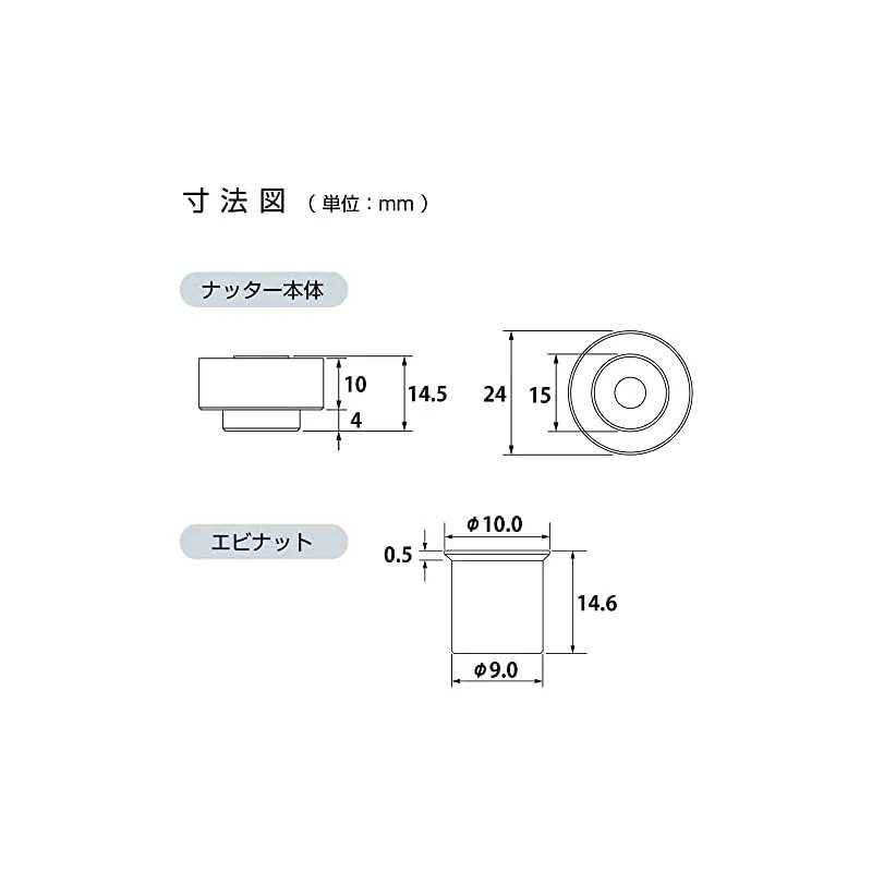 【商品概要】 かしめ板厚(mm):1.0~3.2 下穴径(mm):9.1 適用ねじ:M6×1.0 ナット外径(mm):10.0 全長(mm):14.6