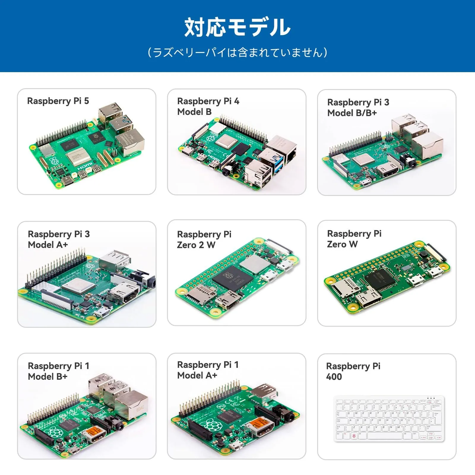 対応機種 - ラズベリーパイ5/4B/3B+/3B/400/3A+/2B/1B+/1A+/Zero W/Zero(※Raspberry piメインボードは付属されていません)