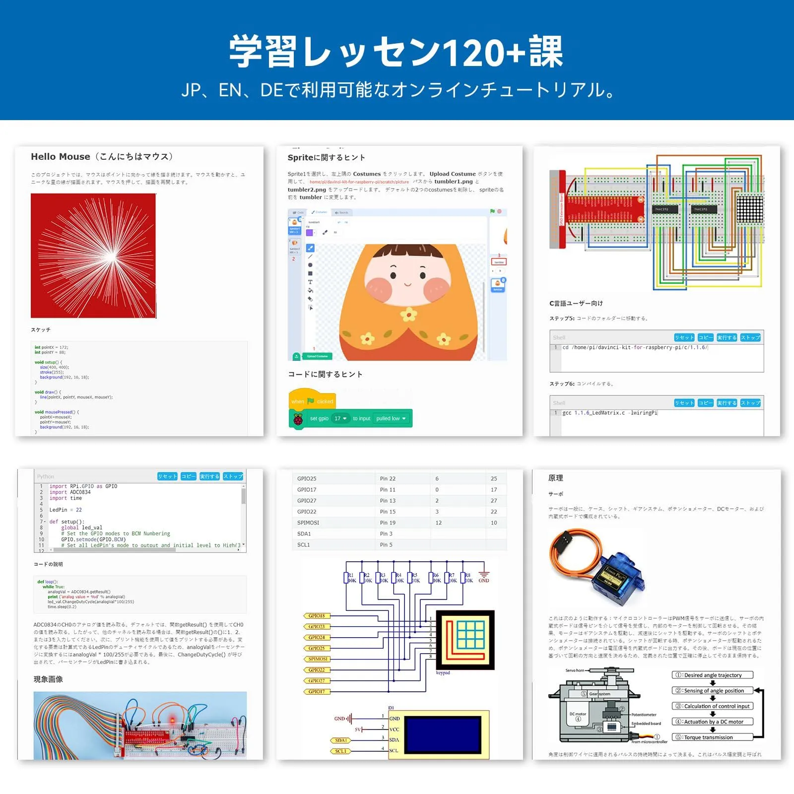 「学習レッスン120課を提供:」ラズパイプログラミングの初心者から上級者まで勉強できる学習レッセン120課を提供しています。個人的な電子工作の開発を促進するために、各レッスンでは、回路図、動作原理の概要、およびプロジェクトで使用されるコードの説明を示しています