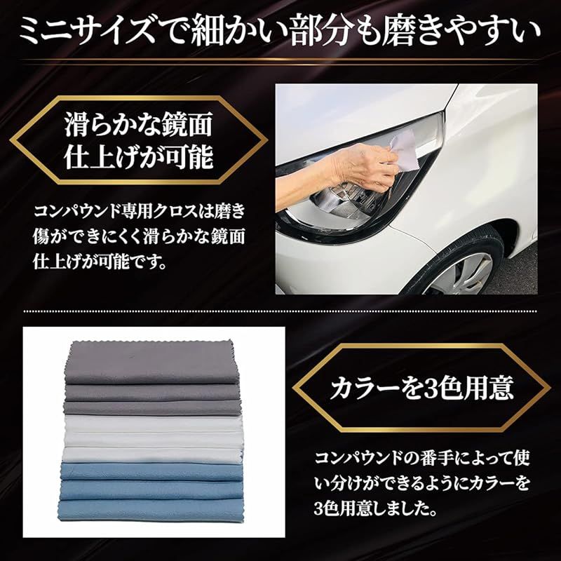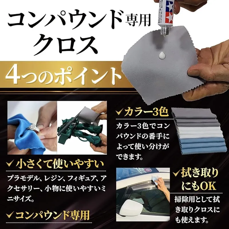 商品名:ミニサイズ コンパウンド専用みがきクロス ホビー用 3色 3枚ずつ 合計9枚 コンパウンド用クロス コンパウンドを使った研磨・ツヤ出し作業に ふき取りにも