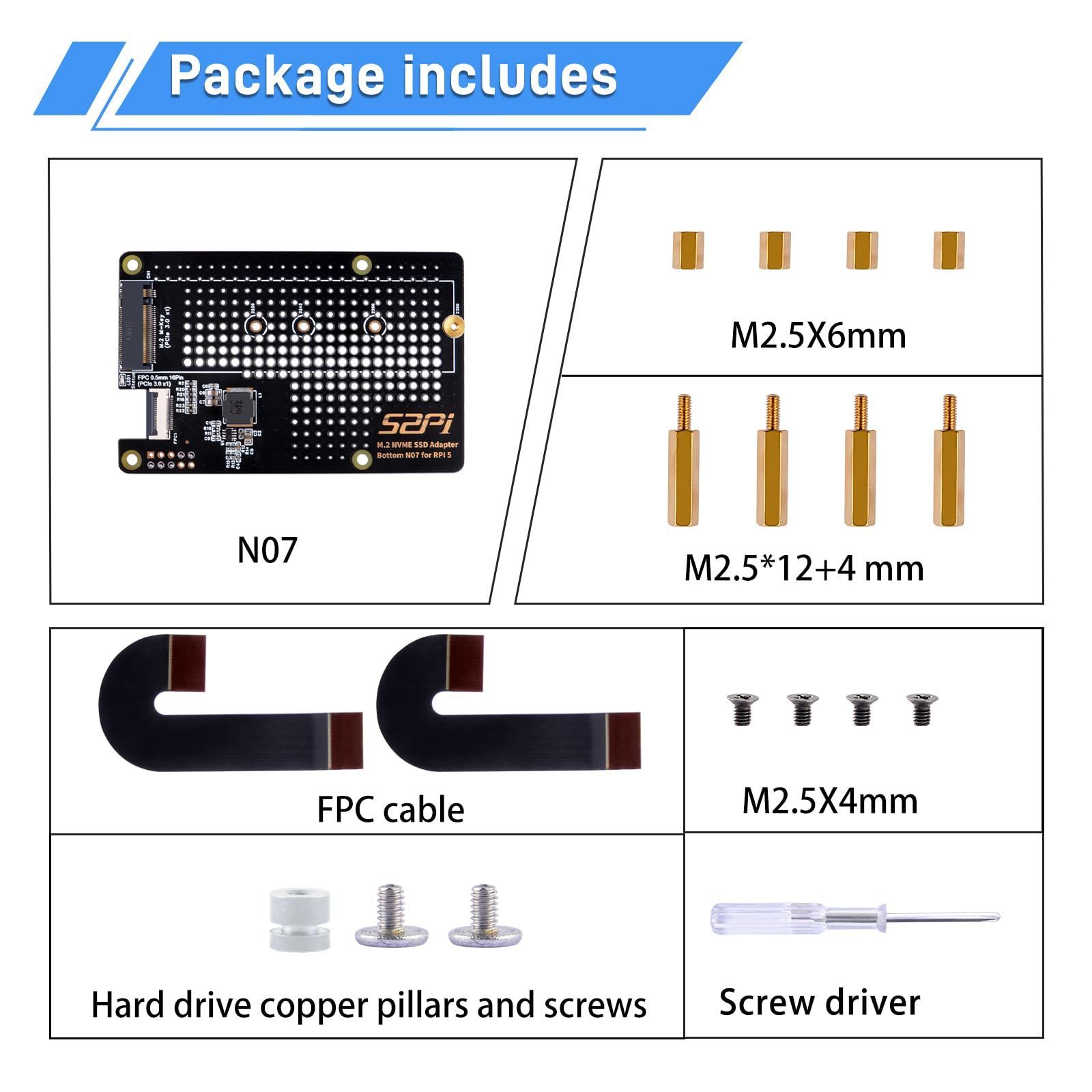 N04 M.2 NVMe - PCIe アダプターは、最新の Raspberry Pi 5 用に設計されています。M.2 フォーマット サイズ 2230、2242、2260、2280 の NVMe (M キー) ドライブの取り付けをサポートしています。追加のカスタム CNC SSD マウント ネジ、 はんだ付けは必要ありません。