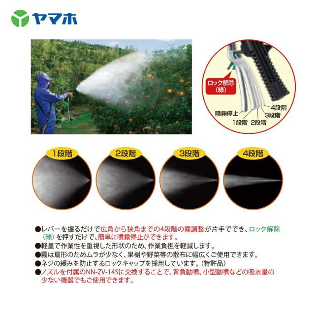 ●レバーを握るだけで広角から狭角までの4段階の霧調整が片手ででき、ロック解除(緑)を押すだけで、簡単に噴霧停止ができます。
