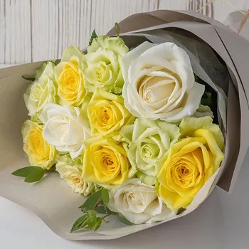 明るいイエローとグリーンのバラと、輝くような存在感がある白バラの瑞々しいブーケです。