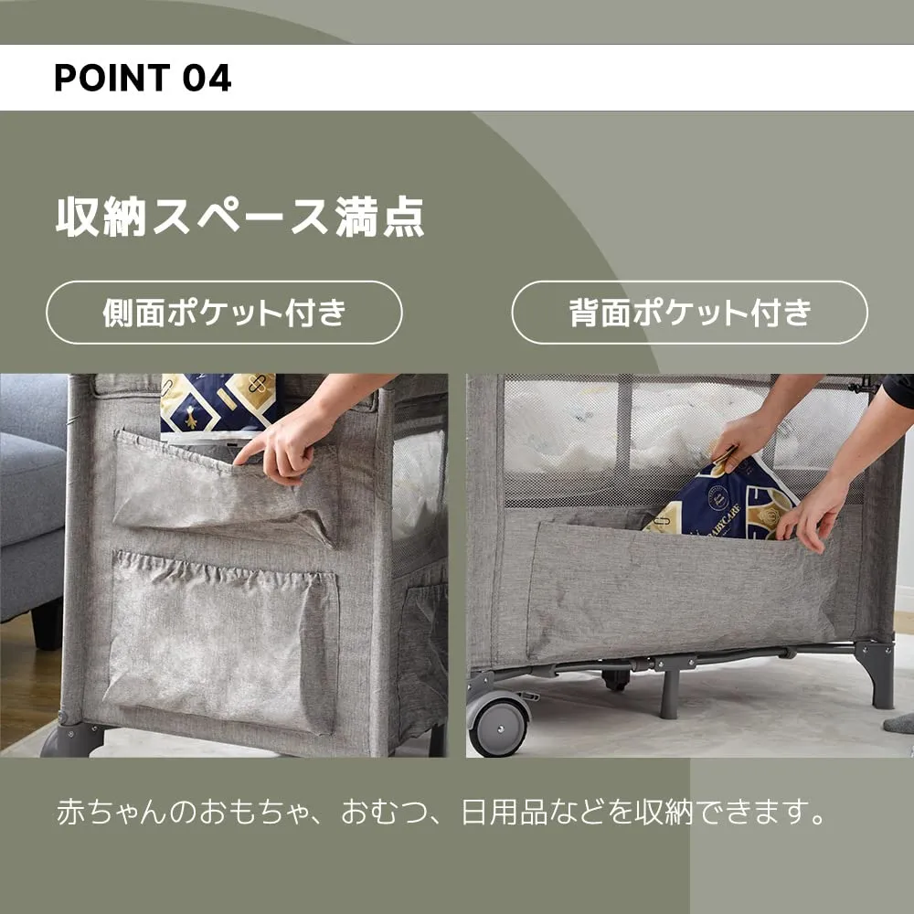 ◆ 04収納スペース満点 側面バック付き背面バック付き赤ちゃんのおもちゃ、おむつ、日用品などを収納できます。