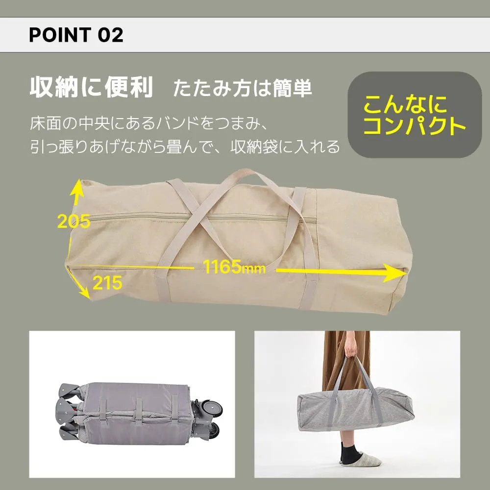 ◆ 02収納に便利 たたみ方は簡単床面の中央にあるバンドをつまみ、引っ張りあげながら畳んで、収納袋に入れるこんなにコンパクト,使わない時はらくにたたんで収納できます。収納時はマットを取り出してから、たたんでください。詳しいたたみ方については取扱説明書をご参照ください。