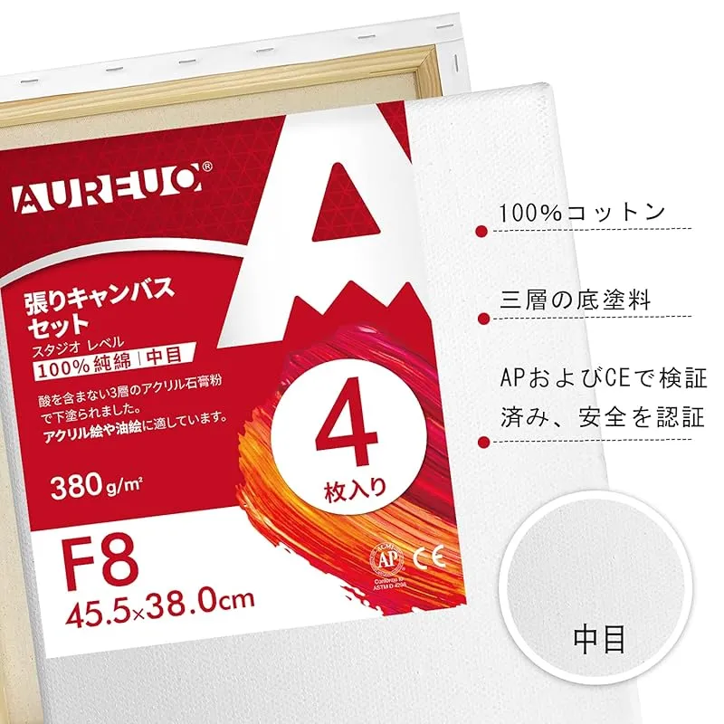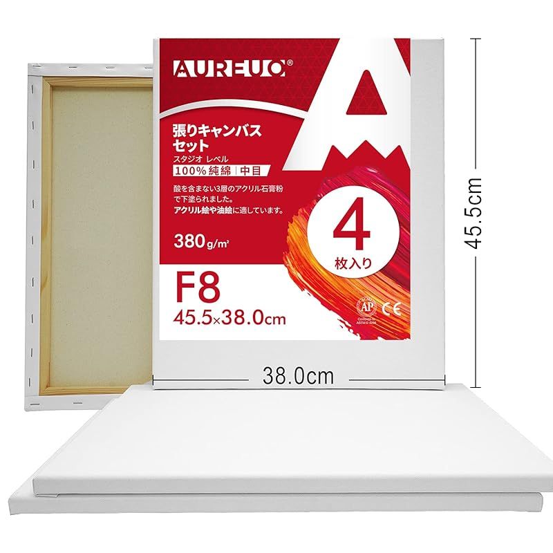 商品名:AUREUO 張りキャンバス セット F8 (45.5cmx38.0cm) 中目 100%コットン 4枚 初心者 絵画用具 芸術絵創作 現代油絵 美術装飾 水彩画・油絵画・アクリル兼用