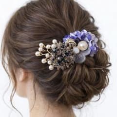 ヘアクリップ パープルフリルフラワー×シャンパンビーズ ヘアアクセサリー