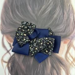 バレッタ リバティ生地 リボン ネイビー 小さめ ヘアアクセサリー シンプル 紺