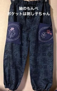 M196 藍染絣 モンペパンツ ゆったりサイズ刺し子 古布リメイク ハンドメイド